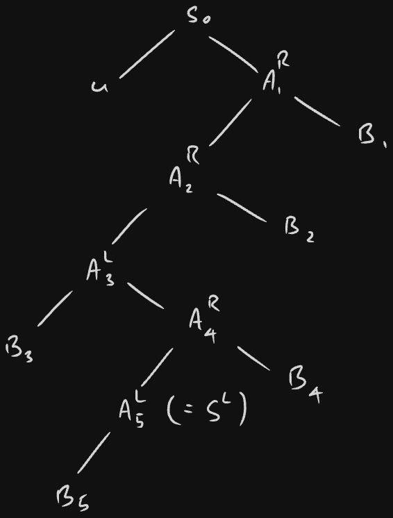 Suppose , and be the first letter of . It is clear from the definition of that the derivation tree of must have a chain of non-terminals , where each , or for some , and . Denote the child of not in by . Here’s an example: