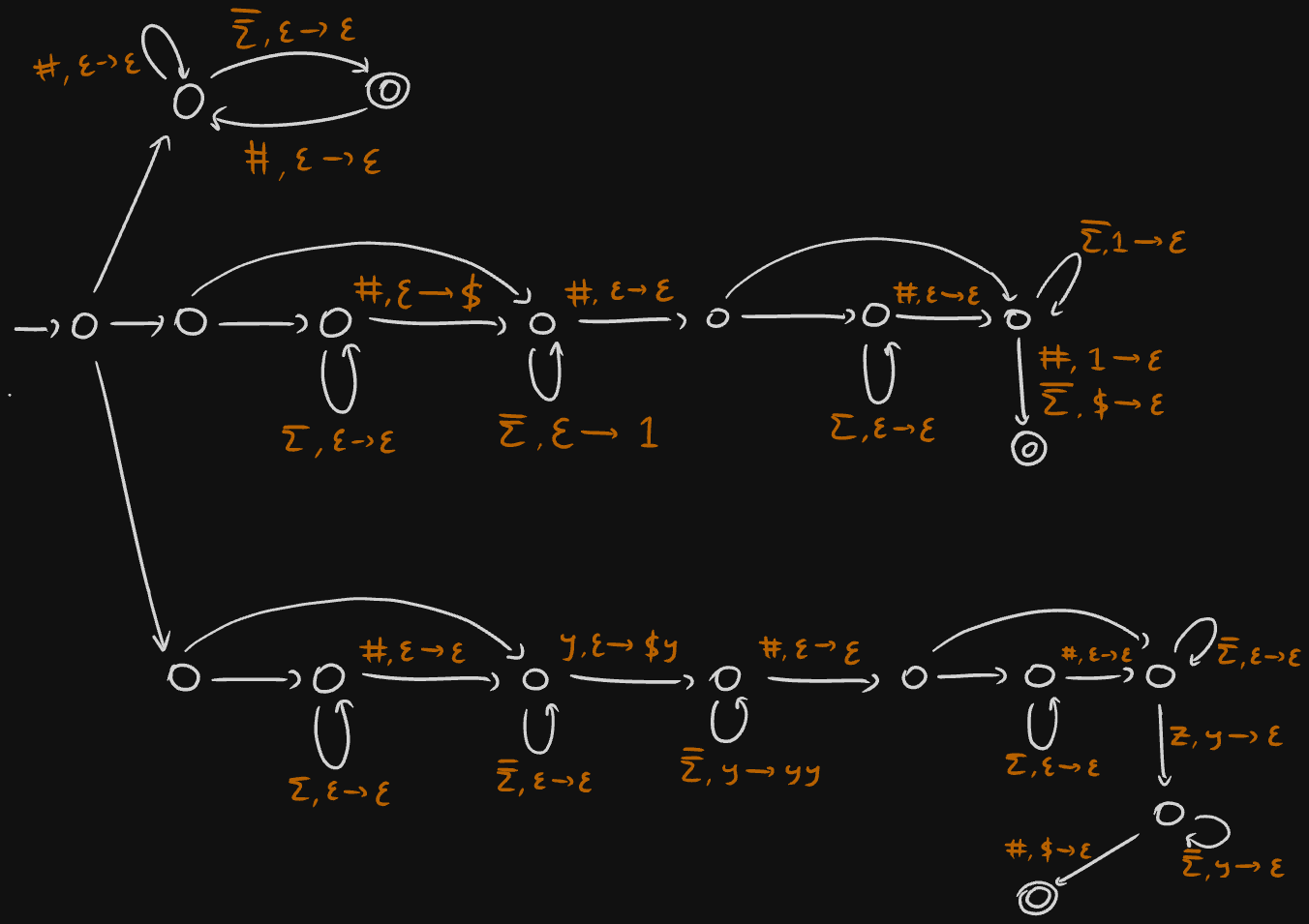 Unlabelled arrows are of type . represents . The transition represents every transition of its type where , , and .