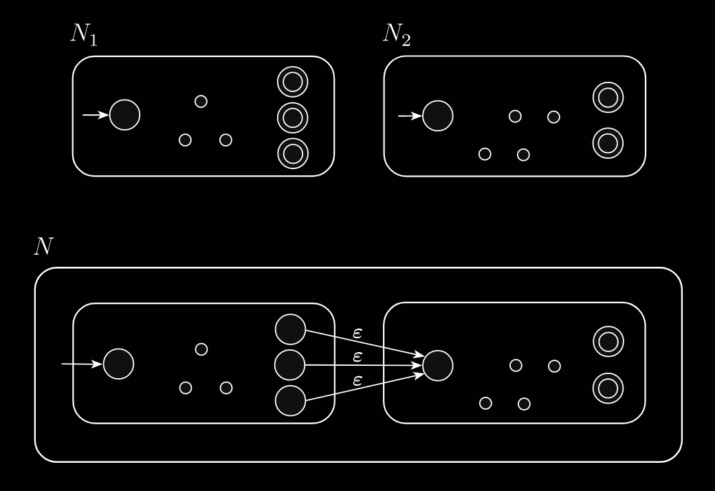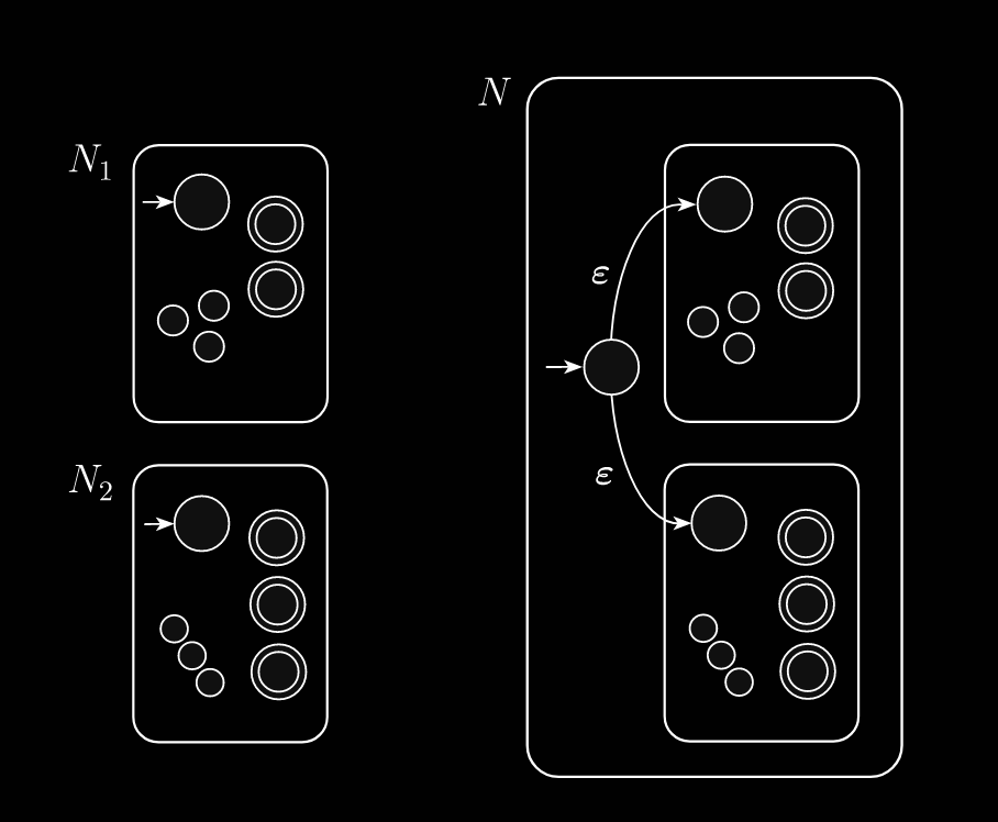 We have to demonstrate an which recognizes . One method is to use the product construction and have be an accept state of if or . Alternatively, use the following NFA construction: