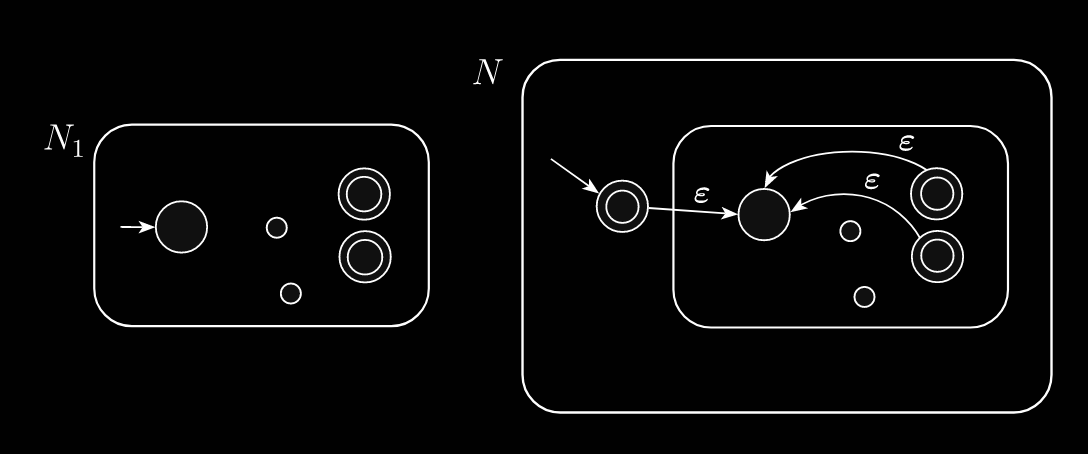 Let be an NFA over recognizing . Create a copy of . Remove all transitions in . Connect two states in with an arrow labelled if can be reached from on reading in .