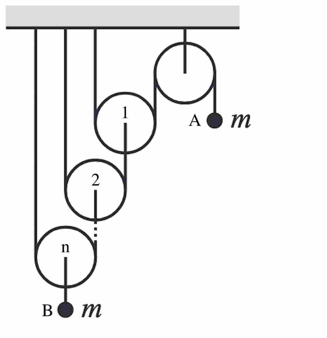 Let have acceleration and tension acting upward. Then, from the conservation of string, pulley 1 must have upward acceleration of , pulley 2 , and pulley (and hence ) . Similarly, if experiences an upward tension of , pulley 1 must experience a total upward tension of , pulley 2 , and pulley (and hence ) .