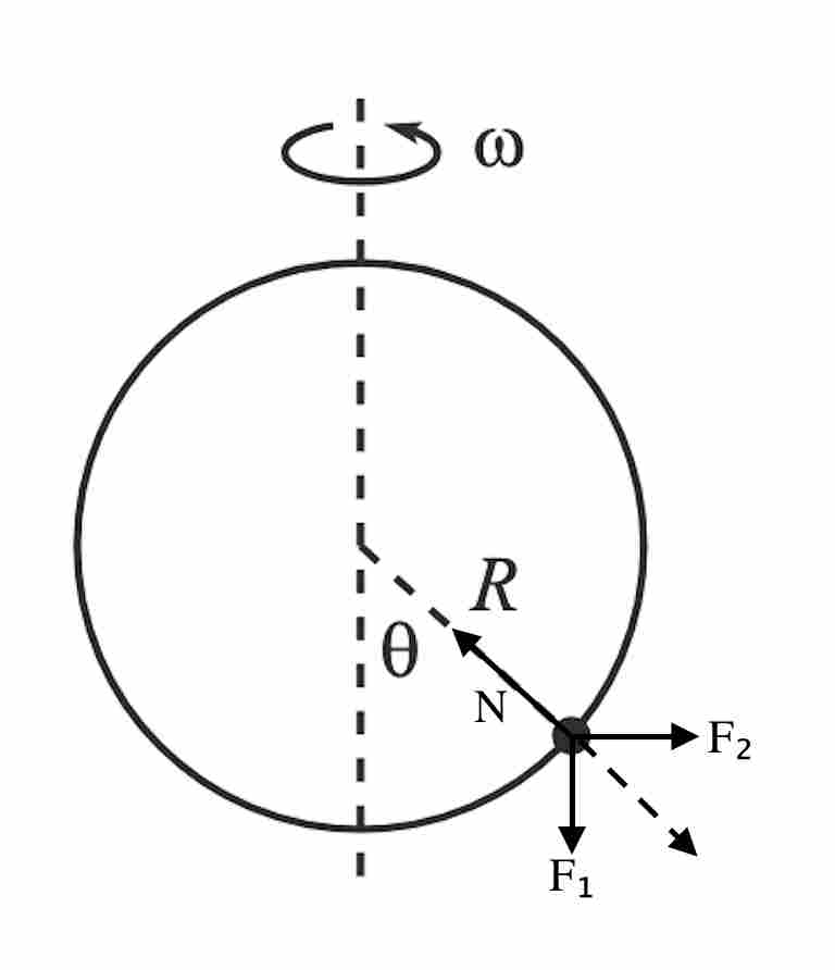 From the frame of reference of the hoop, the bead will experience a fictitious force , gravitational force , and normal force due to the hoop . For the bead to remain at the same angle relative to the vertical, the resultant of and must be antiparallel to . Thus,