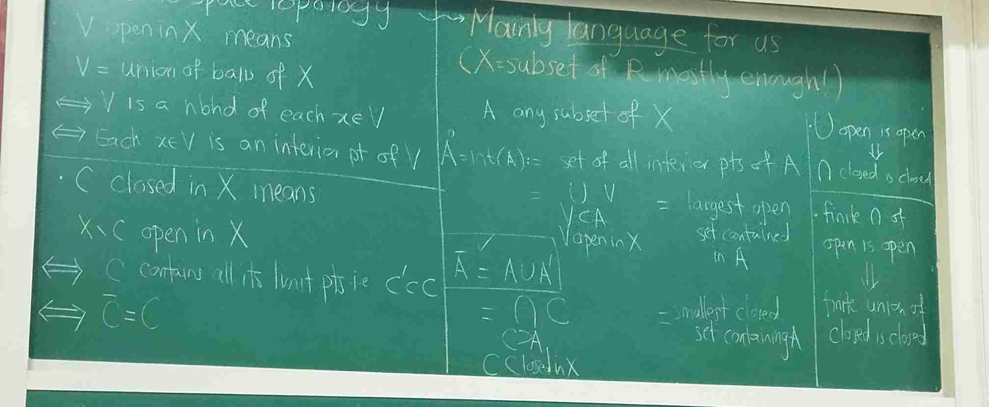 We have developed two ways to think about continuity - the epsilon-delta definition and the theorem about inverse images under a continuous function of open sets being open sets.